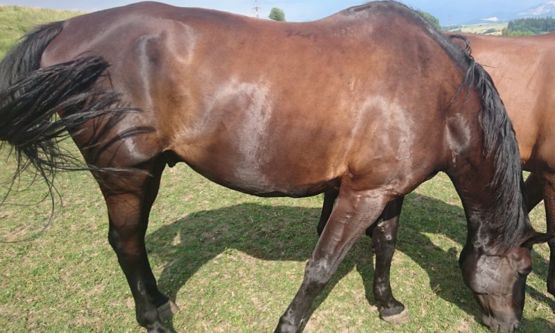 12 ročný valach slovenského teplokrvníka. Veľký sarkoid na bruchu a malé sarkoidy po tele. Problémy s kolikami. Fotky sú fotené pred užívaním doplnku výživy Crystalina Horses Anti Sarkoid a po 100 dňoch užívania Crystalina Horses Anti Sarkoid.
