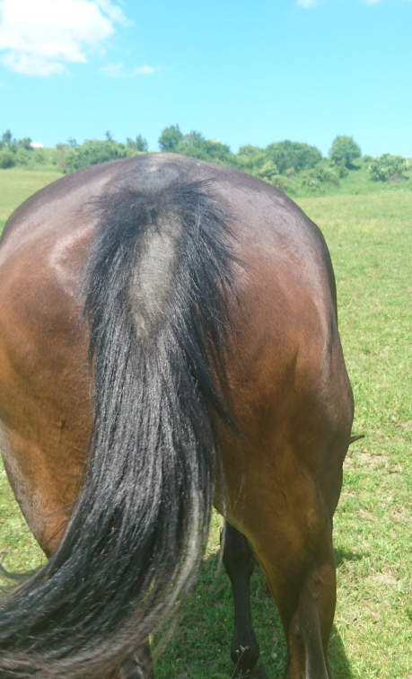 13 ročná kobyla slovenského teplokrvníka mala problém s vypadanou srsťou v zadnej časti tela, podozrenie na plesňové ochorenie. Fotky sú fotené pred užívaním doplnku Crystalina Horses, po 2 týždňoch a po 3 týždňoch užívania doplnku. V tomto období nedostávala žiadnu liečbu iba doplnkové krmivo Crystalina Horses.